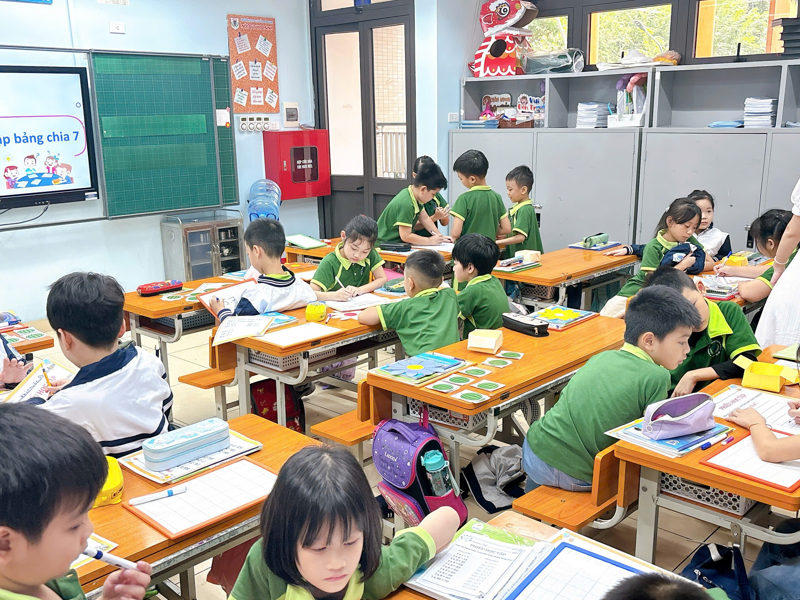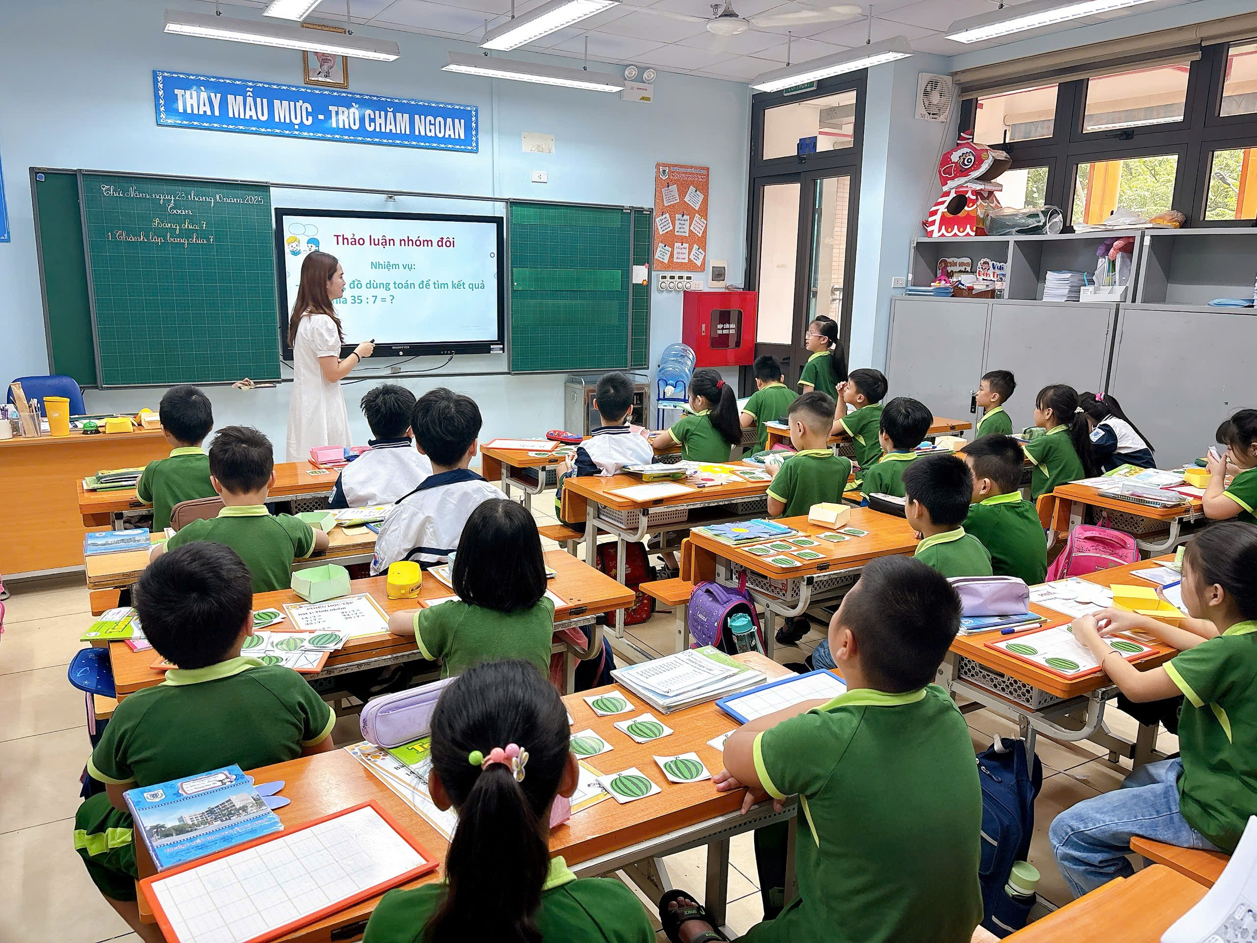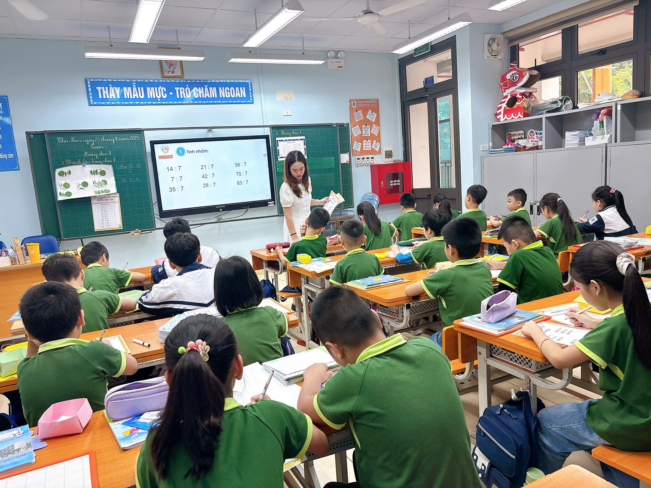 Ngay từ phần khởi động, cô Dung đã khéo léo tạo không khí học tập vui tươi bằng những câu hỏi gợi mở và trò chơi nhỏ giúp học sinh nhanh chóng ôn lại kiến thức về bảng nhân 7 – nền tảng quan trọng để hình thành bảng chia 7. Học sinh tích cực tham gia, giơ tay, phát biểu sôi nổi, thể hiện sự tự tin và yêu thích môn Toán.