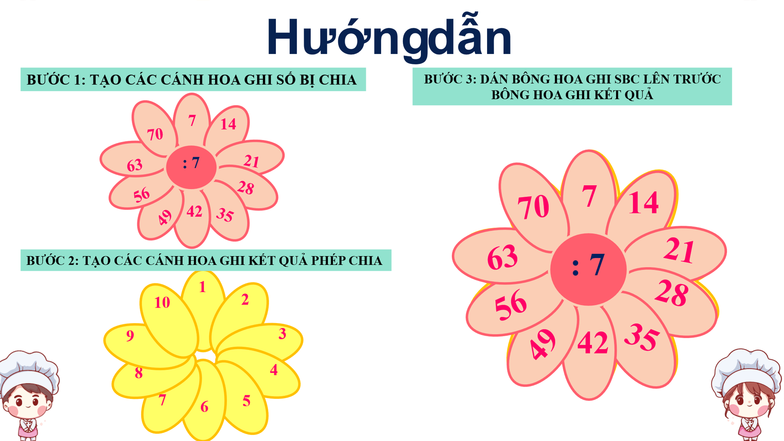 Đặc biệt, hoạt động trải nghiệm STEM ở phần cuối tiết học đã để lại nhiều ấn tượng sâu sắc. Dưới sự hướng dẫn tận tình của cô Dung, học sinh được tự tay làm “Bông hoa bảng chia 7” – một sản phẩm vừa sáng tạo, vừa giúp củng cố kiến thức. Mỗi cánh hoa ghi một phép chia tương ứng, khi ghép lại thành bông hoa đầy màu sắc và ý nghĩa. Các em say mê, tỉ mỉ cắt dán, trang trí, đồng thời ôn luyện lại bảng chia 7 một cách tự nhiên và hứng thú.