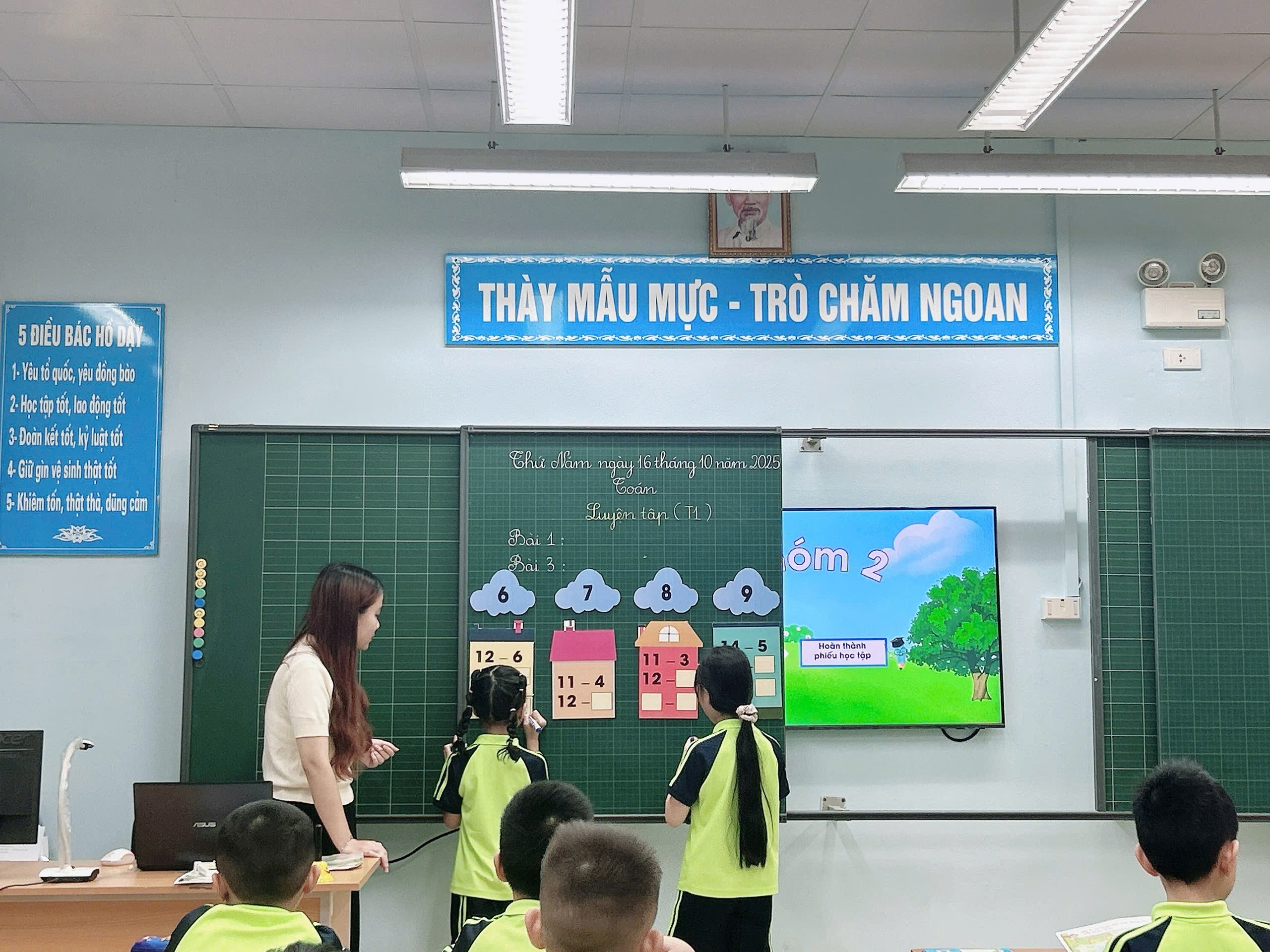 Tiết học được bắt đầu bằng phần khởi động vui nhộn, ứng dụng công nghệ AI để sáng tác bài hát rap “Bảng trừ vui ghê!”. Các em đã được cùng nhau ôn lại các phép tính trừ trong phạm vi 20. Không khí lớp học trở nên sôi nổi khi từng tổ cùng hát vang, nhảy múa, tạo nên khởi đầu đầy năng lượng cho cả tiết học.