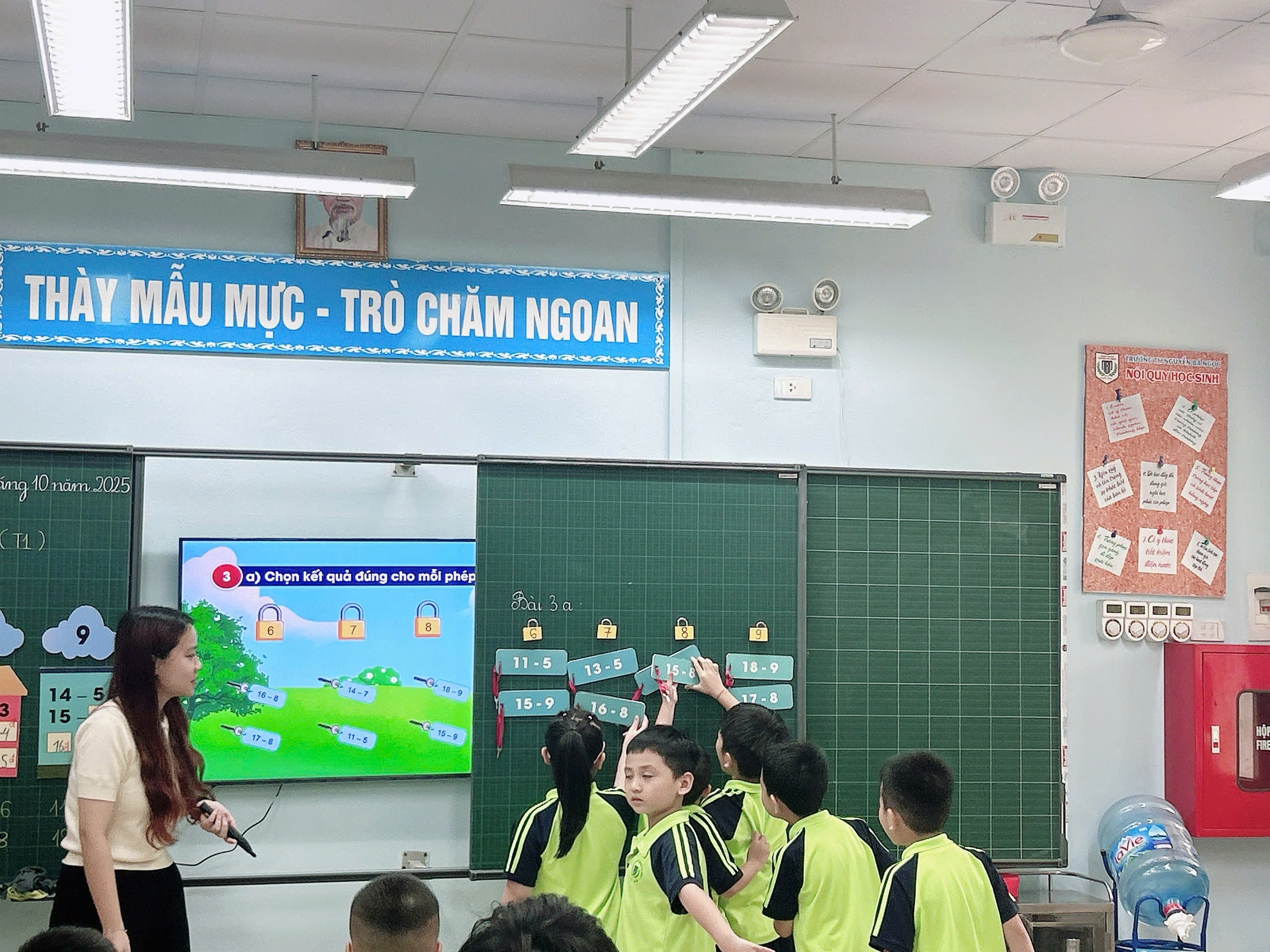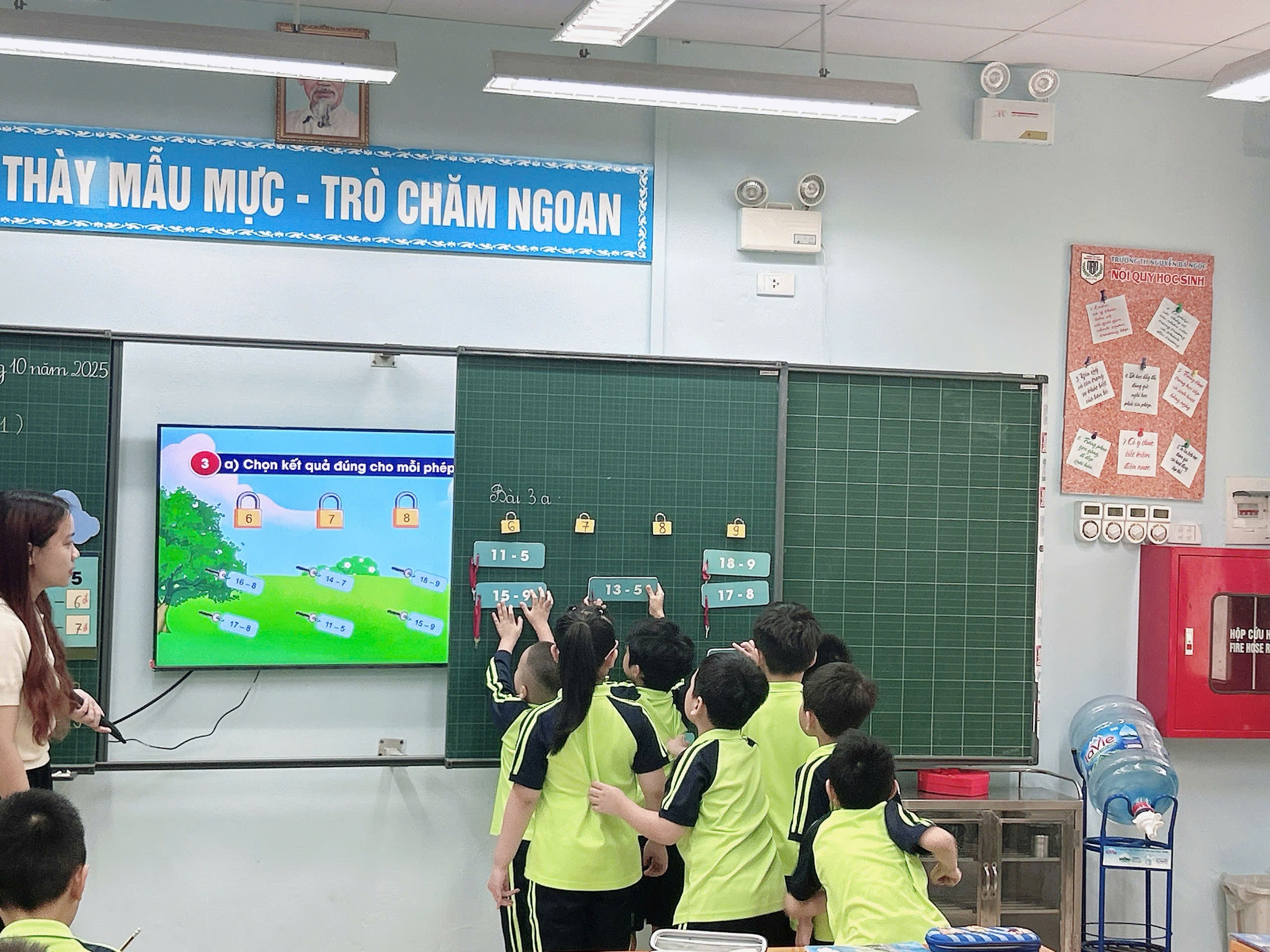 Điểm nhấn của tiết học là trò chơi “Ai nhanh hơn” – một hoạt động thực hành sáng tạo mô phỏng các phép trừ bằng việc ghép chìa khóa với ổ khóa mang kết quả phù hợp. Trò chơi không chỉ giúp các em củng cố kiến thức đã học một cách tự nhiên mà còn khơi dậy tinh thần hợp tác, khả năng phản xạ nhanh và sự tự tin thể hiện bản thân. Những tiếng cười, tiếng cổ vũ vang lên liên tục, tạo nên một không khí học tập tích cực, vui vẻ.