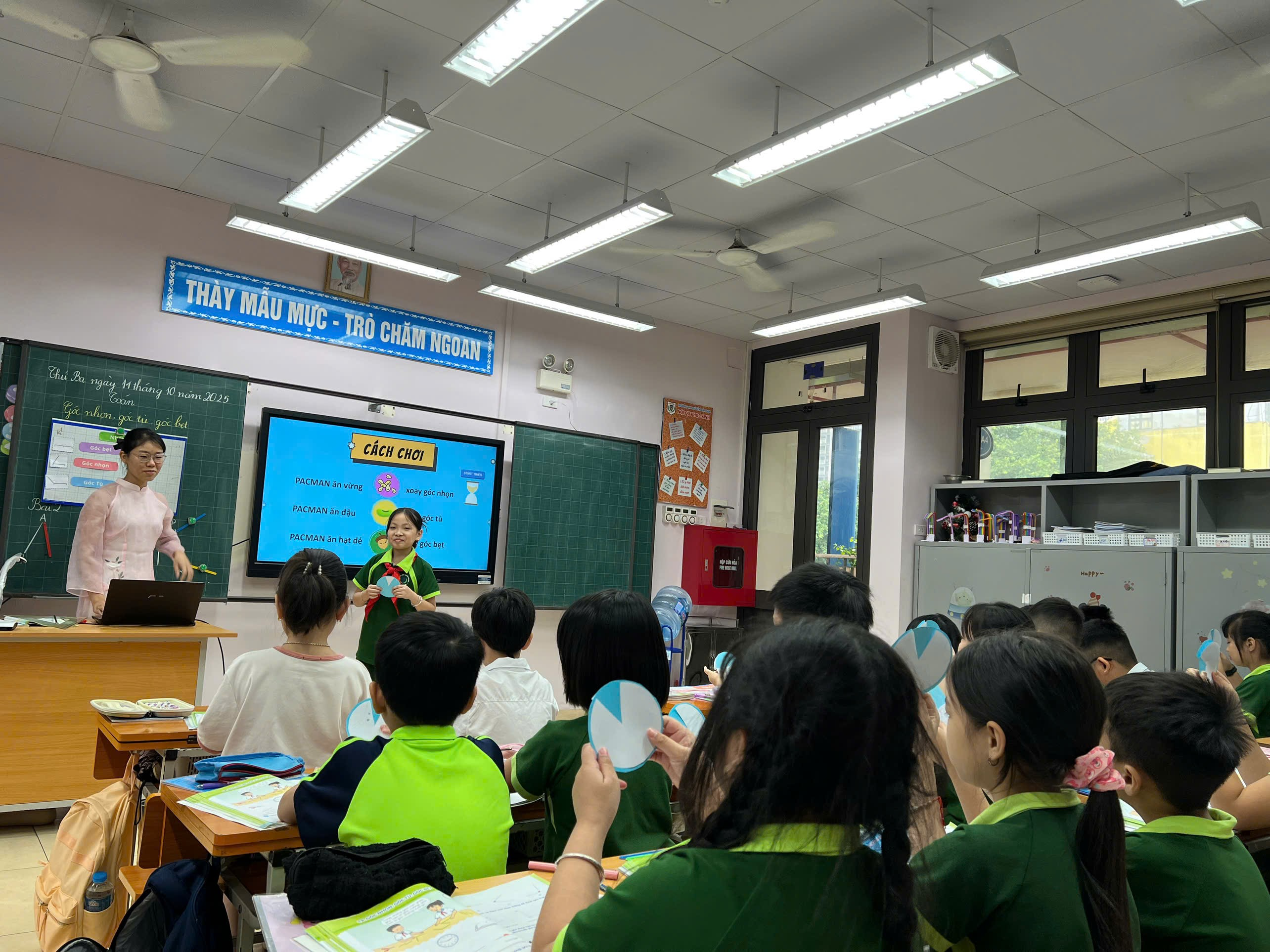 Tiết học bắt đầu với màn khởi động sôi động, giúp các em tập trung và sẵn sàng tinh thần học tập. Các động tác và lời ca không chỉ giúp lớp học bừng tỉnh mà còn gợi mở một cách trực quan về hình dạng của các đường thẳng, tạo tiền đề để các em dễ dàng tiếp nhận khái niệm góc.