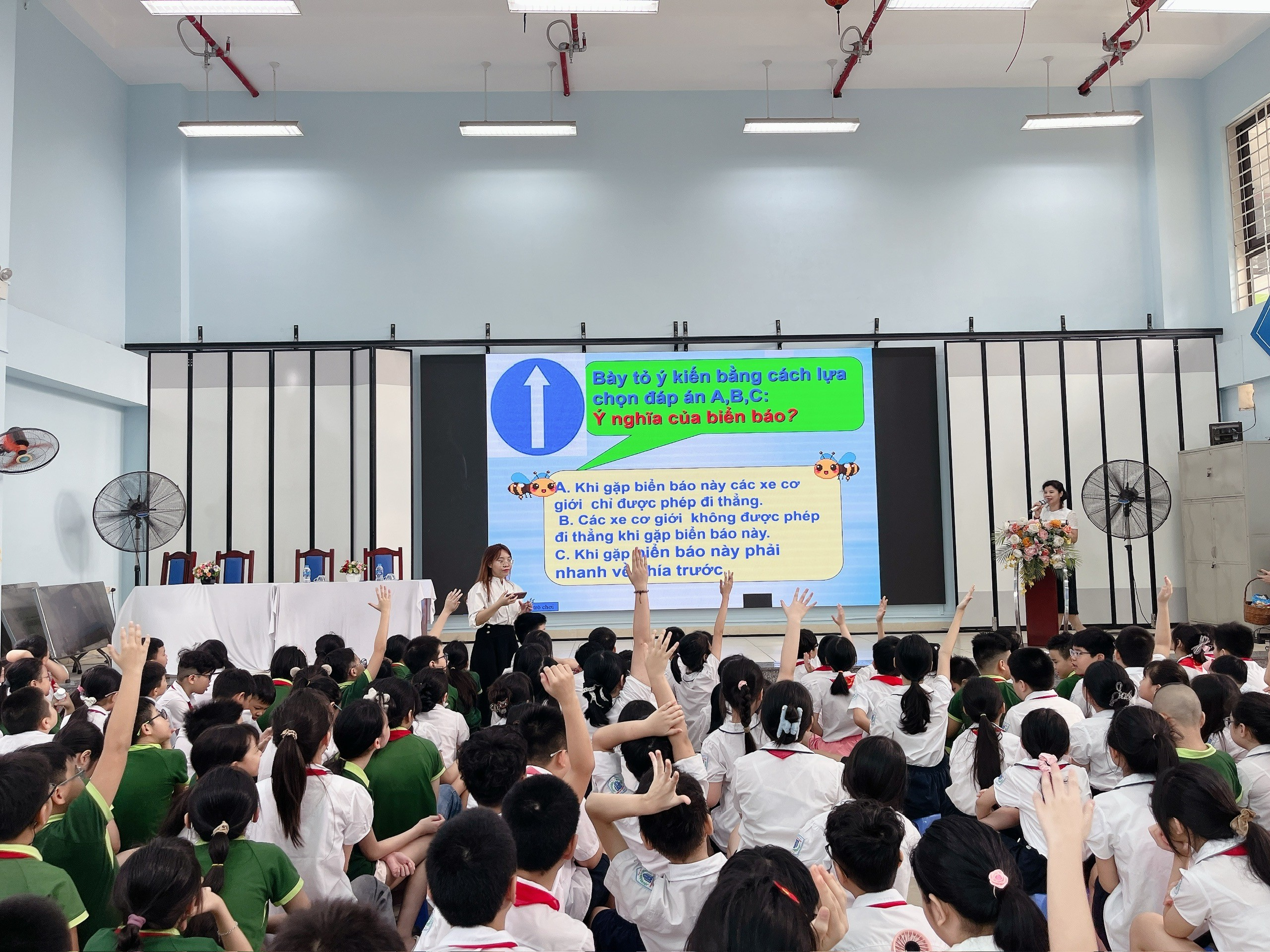Ngoài ra, các em học sinh còn được tham gia trò chơi Nhận biết một số biển báo giao thông thường gặp. Phần trả lời câu hỏi nhanh diễn ra sôi nổi, rộn rã tiếng cười, để lại nhiều ấn tượng đẹp khi các em thể hiện sự hiểu biết và tinh thần trách nhiệm. Niềm vui còn nhân đôi khi các em nhận được những phần quà xinh xắn, ý nghĩa, khích lệ tinh thần học tập và rèn luyện.