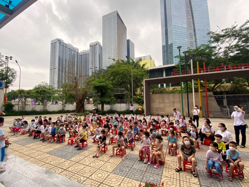 Các bé được tập trung dưới sân trường để lắng nghe cô Tổng phụ trách giới thiệu.