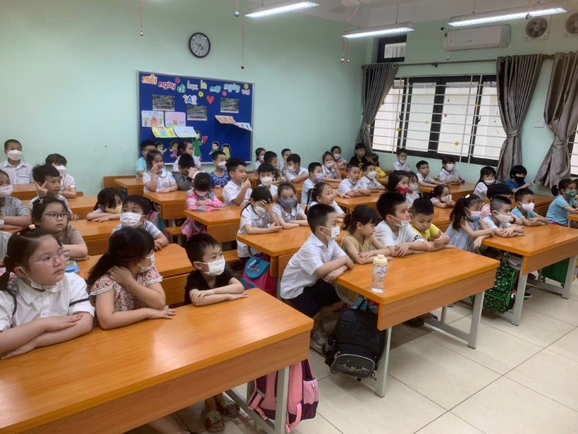 Học sinh được nghe hướng dẫn về nền nếp và các anh chị giới thiệu những đồ dùng học tập của lớp 1.