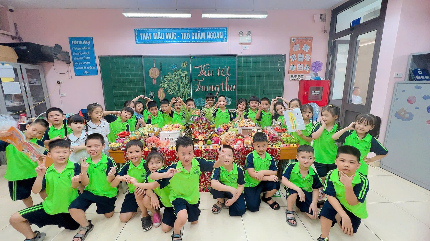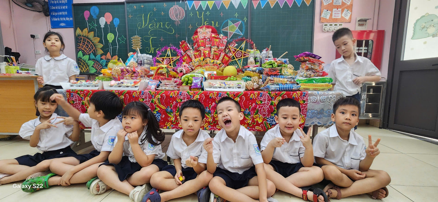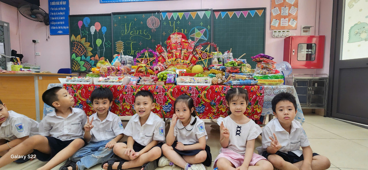 Ngay từ sáng sớm, sân trường đã trở nên rực rỡ và nhộn nhịp. Những chiếc đèn ông sao, bóng bay nhiều màu sắc và mâm cỗ Trung Thu đầy ắp bánh trái đã tạo nên khung cảnh vui tươi, đầm ấm. Tiếng cười, tiếng nói ríu rít của các em học sinh khối 1 khiến không gian như bừng sáng dưới ánh trăng rằm tháng Tám.
