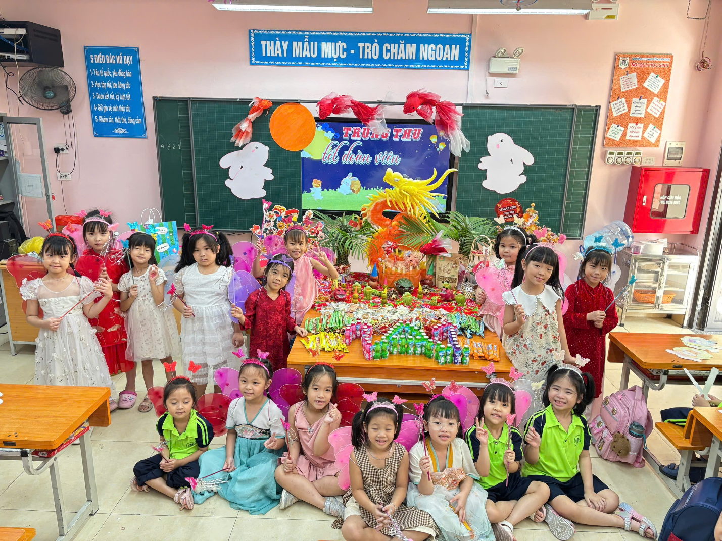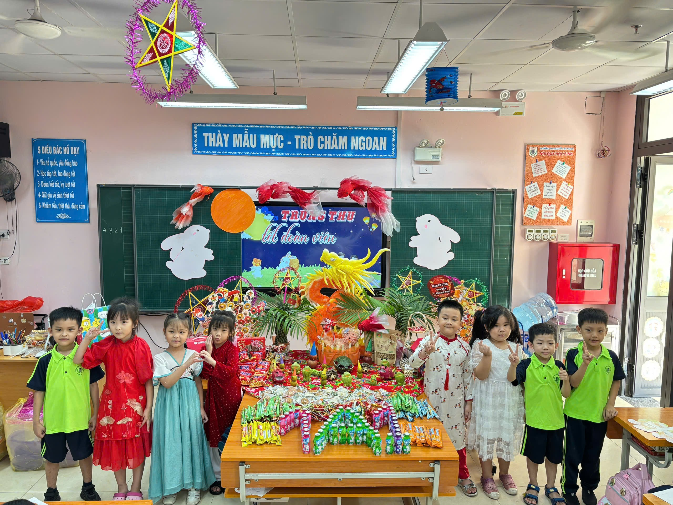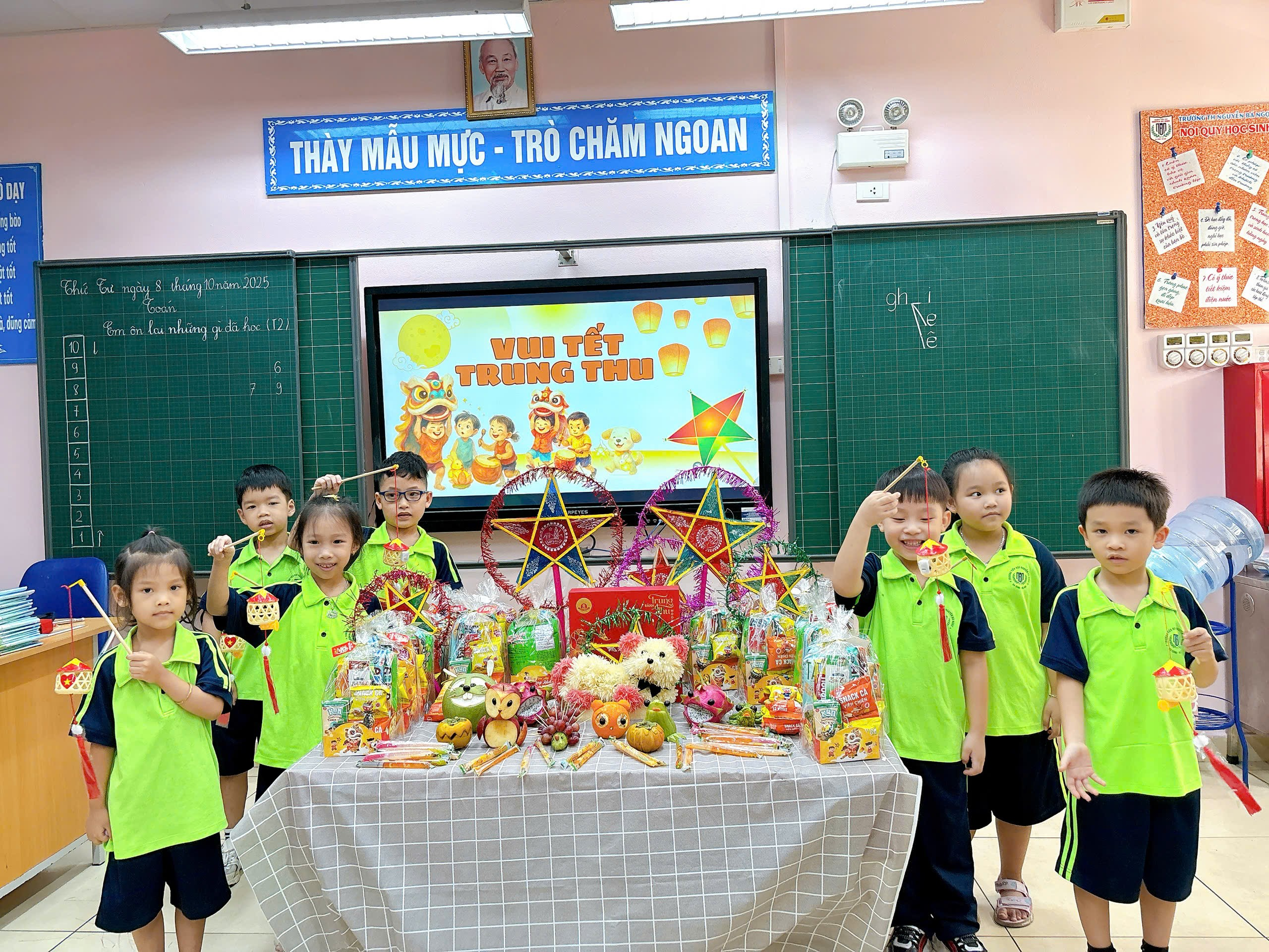 Ngay từ sáng sớm, sân trường đã trở nên rực rỡ và nhộn nhịp. Những chiếc đèn ông sao, bóng bay nhiều màu sắc và mâm cỗ Trung Thu đầy ắp bánh trái đã tạo nên khung cảnh vui tươi, đầm ấm. Tiếng cười, tiếng nói ríu rít của các em học sinh khối 1 khiến không gian như bừng sáng dưới ánh trăng rằm tháng Tám.