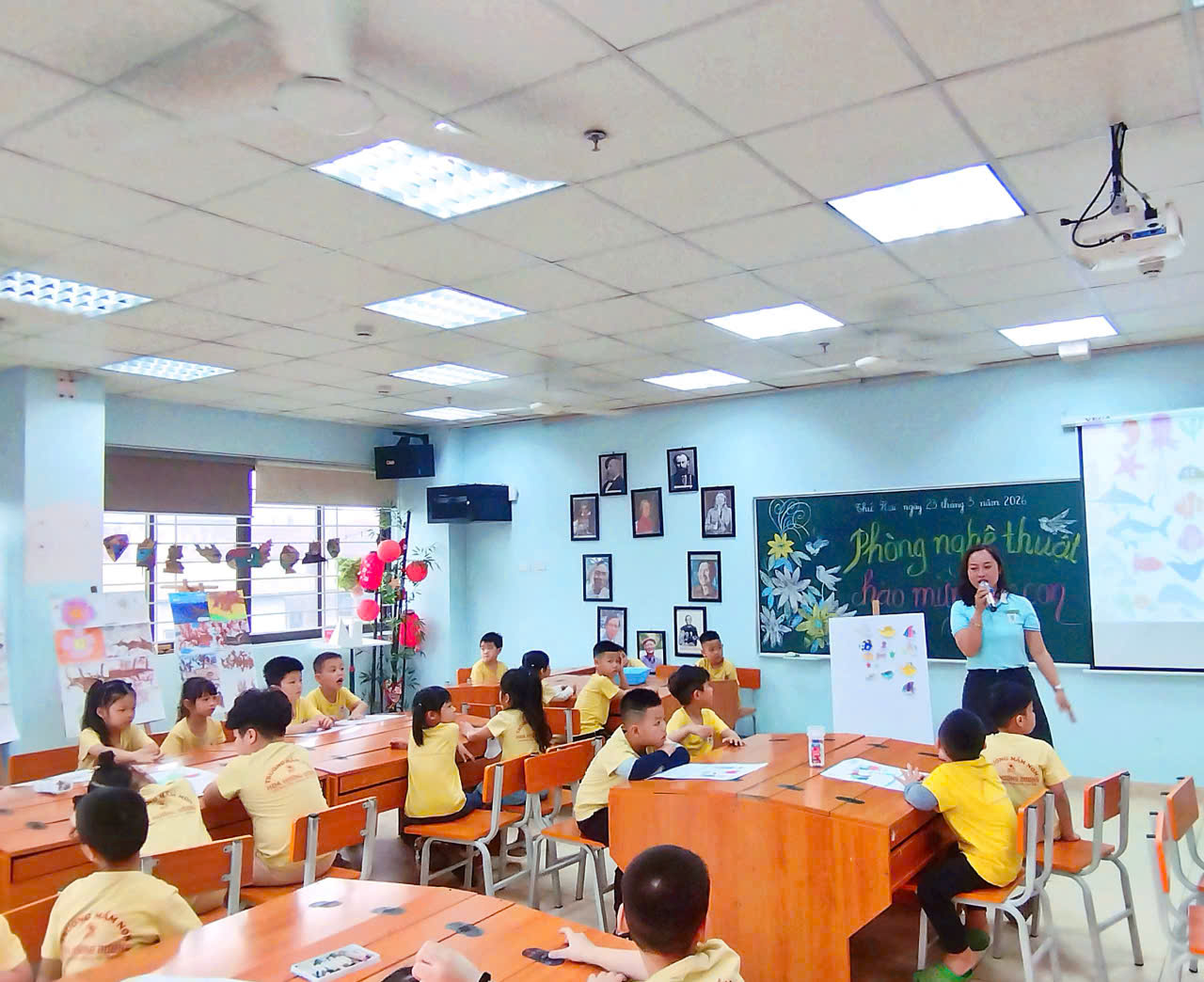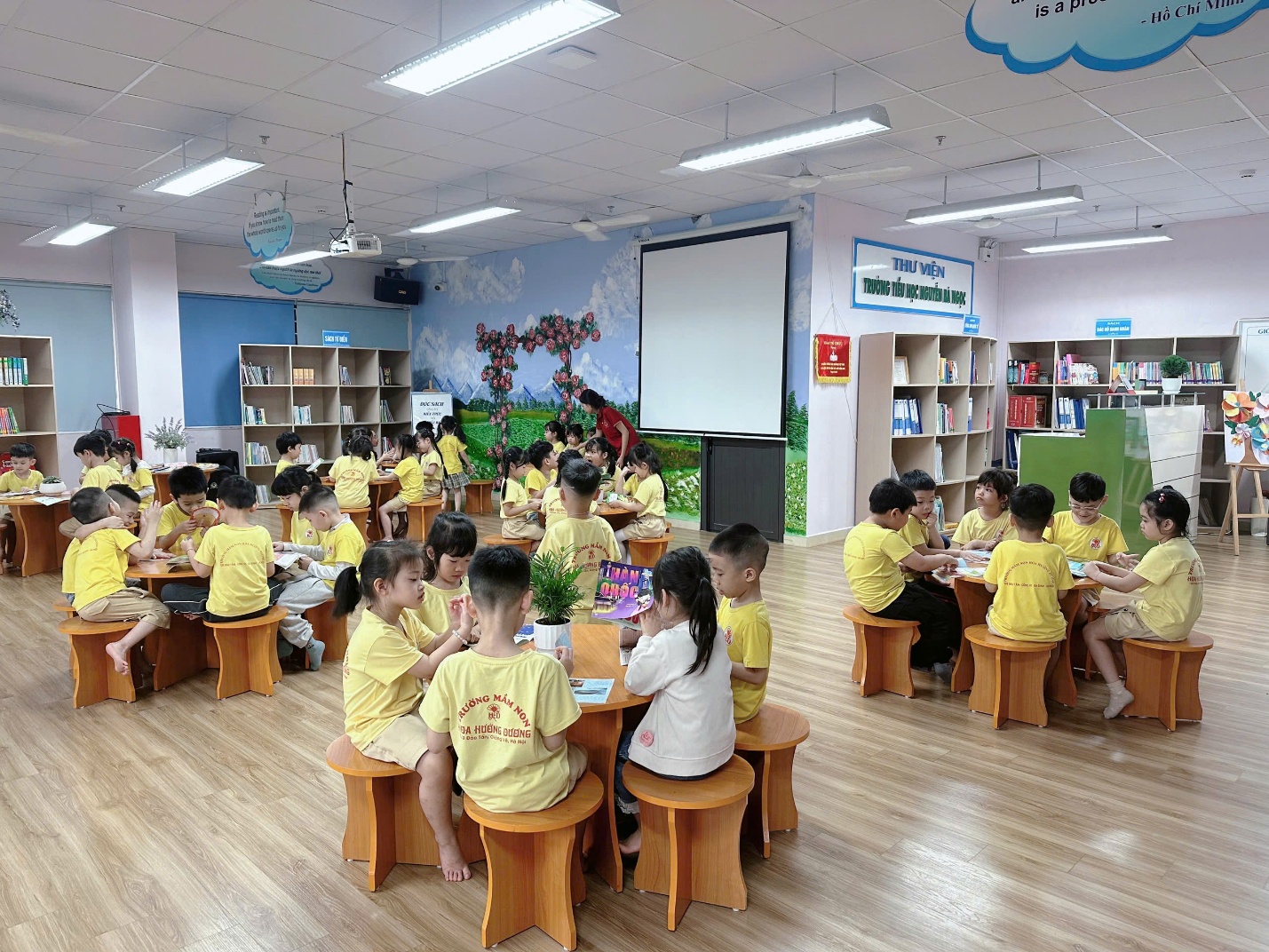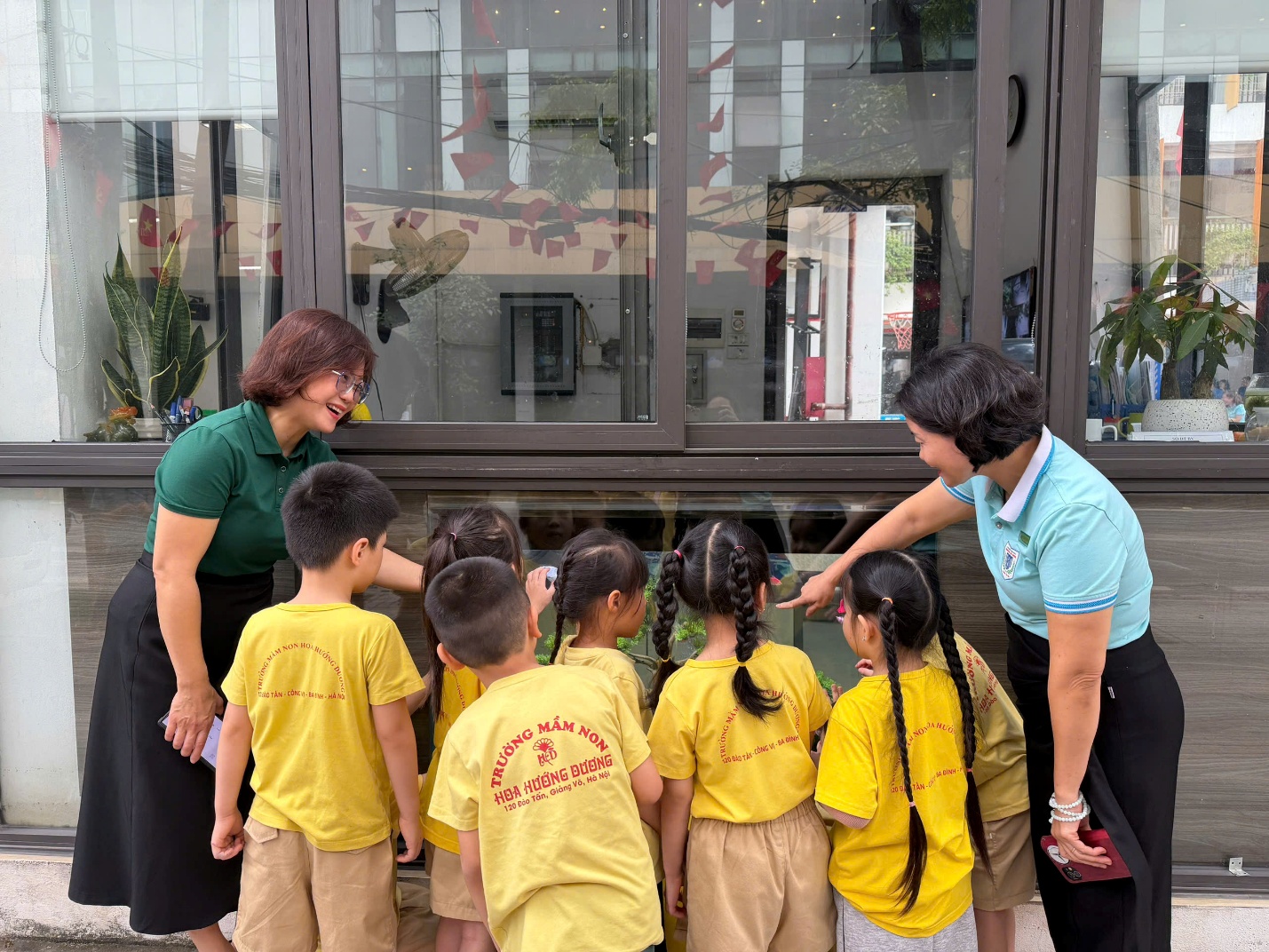 Trong chương trình, các em được tham quan khuôn viên nhà trường với nhiều khu vực như phòng học, khu vực bể cá, thư viện, sân chơi, và các không gian sinh hoạt chung. Mỗi điểm đến đều mang lại những trải nghiệm thú vị, giúp các em hiểu thêm về việc học tập và sinh hoạt hằng ngày ở trường tiểu học, từ đó thêm háo hức mong chờ ngày được vào lớp 1.