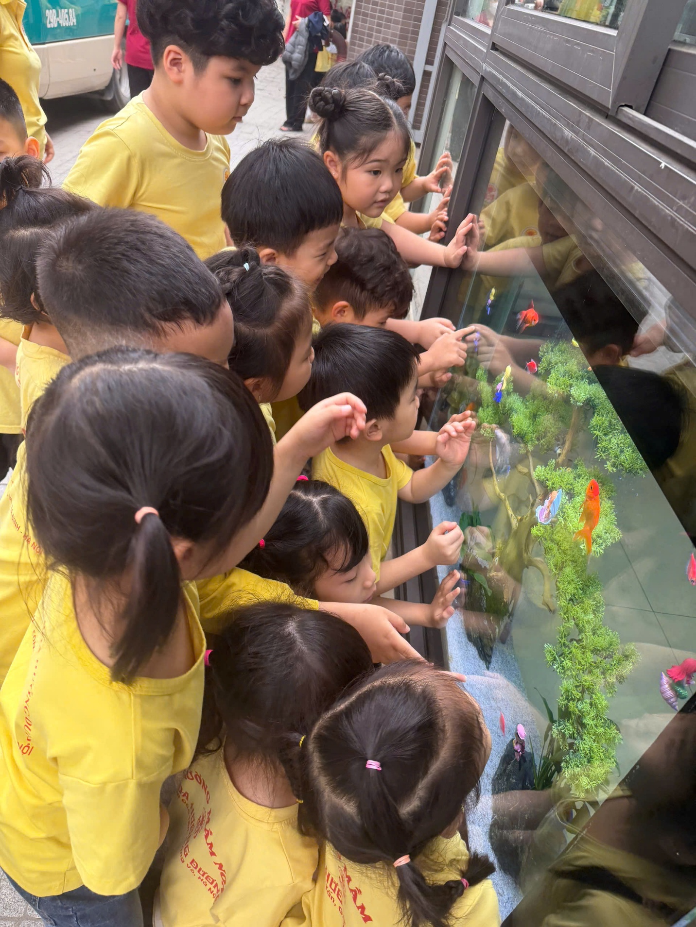 Trong chương trình, các em được tham quan khuôn viên nhà trường với nhiều khu vực như phòng học, khu vực bể cá, thư viện, sân chơi, và các không gian sinh hoạt chung. Mỗi điểm đến đều mang lại những trải nghiệm thú vị, giúp các em hiểu thêm về việc học tập và sinh hoạt hằng ngày ở trường tiểu học, từ đó thêm háo hức mong chờ ngày được vào lớp 1.