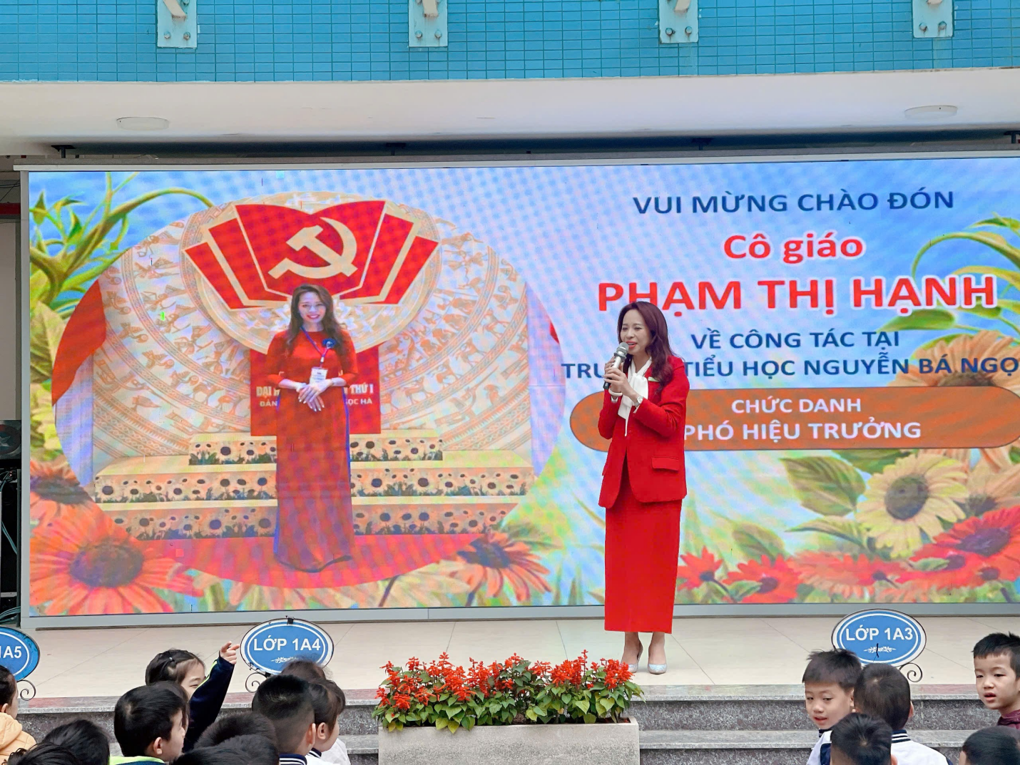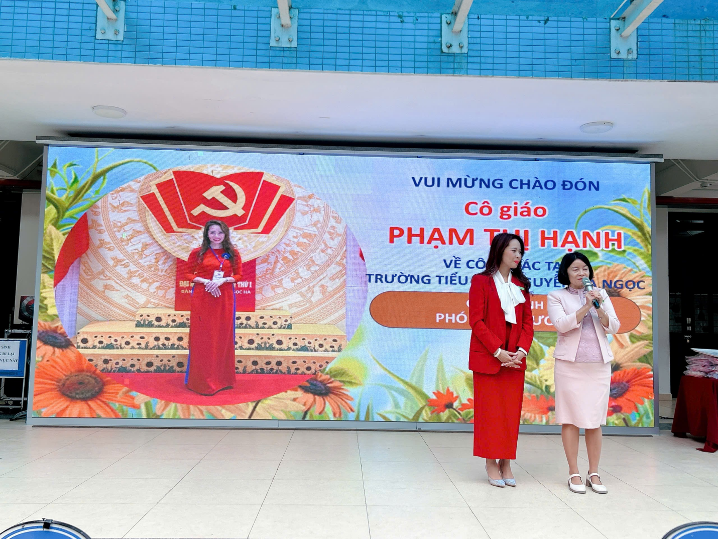 Cô Phùng Tố Nga – Bí thư Chi bộ, Hiệu trường nhà trường – giới thiệu đến toàn thể học sinh về cô Hiệu phó mới.