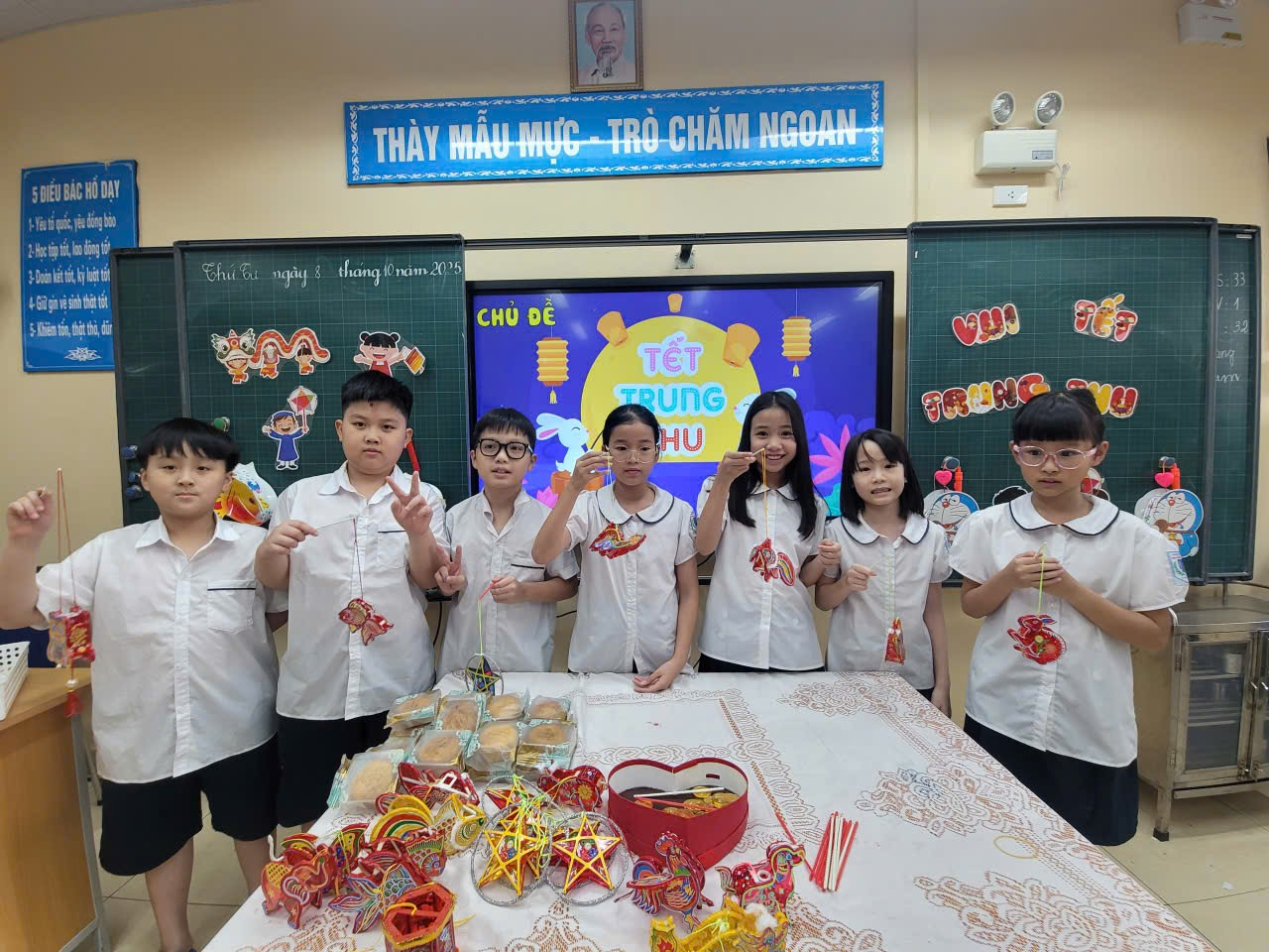 Chương trình kết thúc bằng hoạt động phá cỗ Trung thu. Những mâm cỗ đầy ắp bánh nướng, bánh dẻo, hoa quả, kẹo và trái cây được các em cùng nhau chia sẻ trong không khí vui tươi, đoàn kết. Đây không chỉ là dịp để các em tận hưởng hương vị Tết Trung thu mà còn là lúc tình bạn, tình thầy trò thêm gắn bó.