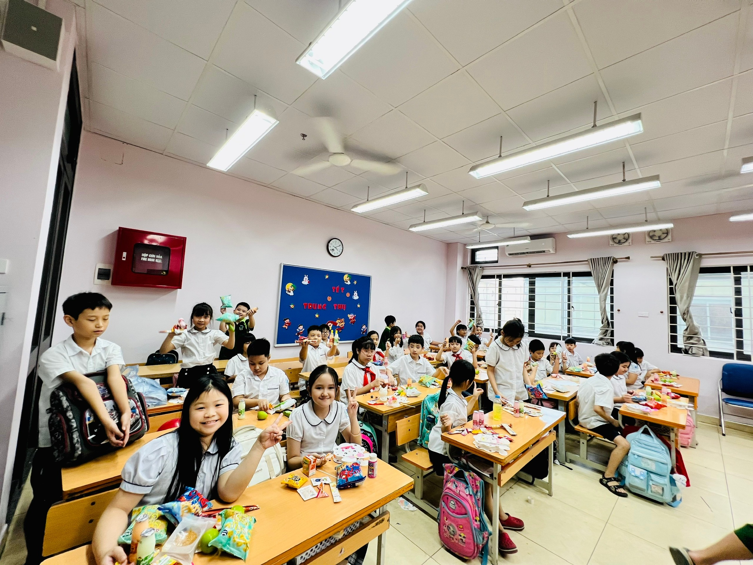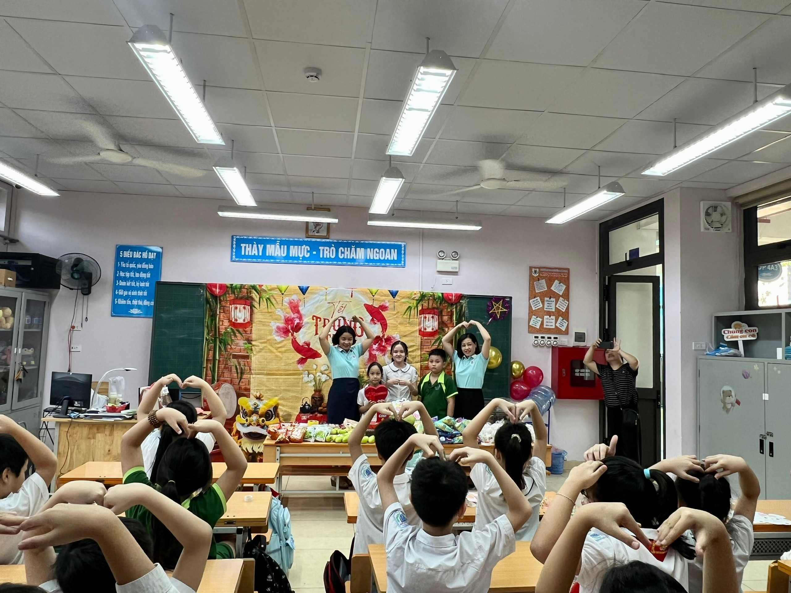 Một trong những khoảnh khắc được các em mong chờ nhất chính là khi tiếng trống múa lân rộn ràng vang lên, báo hiệu đoàn lân sư rồng và Ban Giám hiệu đang đến chúc Tết Trung thu từng lớp. Cô Hiệu trưởng và cô Hiệu phó đã gửi lời chúc Trung thu vui vẻ, chăm ngoan học giỏi đến từng em học sinh. Không khí Trung thu trở nên náo nhiệt, tràn ngập tiếng cười và niềm vui.