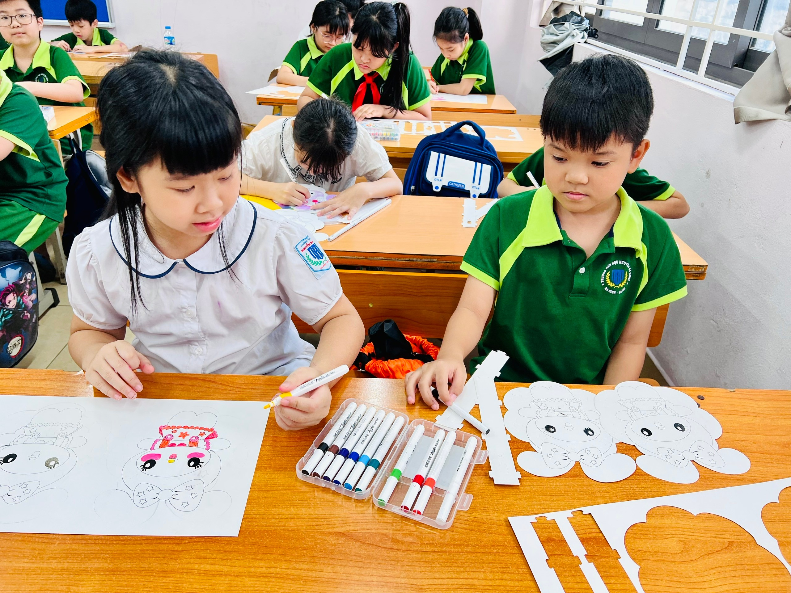 Tiếp nối chương trình là hoạt động làm đèn lồng thủ công. Dưới sự hướng dẫn của giáo viên chủ nhiệm, các em học sinh đã khéo léo sáng tạo nên những chiếc đèn lồng xinh xắn, rực rỡ sắc màu. Mỗi chiếc đèn là một tác phẩm mang dấu ấn cá nhân, thể hiện sự khéo tay, sáng tạo và niềm háo hức đón Trung thu của các em.