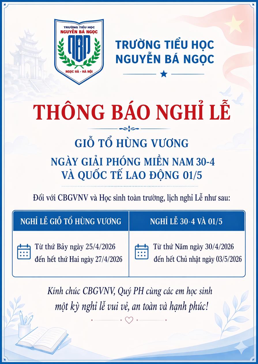 Trường Tiểu học Nguyễn Bá Ngọc thông báo nghỉ lễ Giỗ Tổ Hùng Vương; Ngày Giải phóng miền Nam 30-4 và Quốc tế Lao động 1-5
