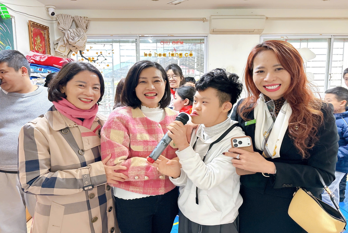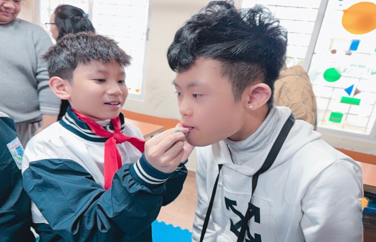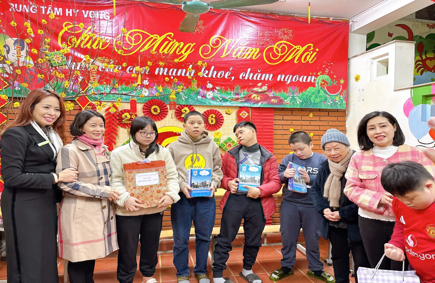 Không khí nơi đây không ồn ào, náo nhiệt như phố phường ngày Tết nhưng lại đong đầy sự ấm áp. Ánh mắt của các em học sinh khuyết tật, những nụ cười hiền hậu của các cô giáo trung tâm khiến ai trong đoàn cũng cũng chợt thấy lòng mình lắng lại. Có những em không thể nói trọn câu chào, có em chỉ nắm nhẹ tay cô giáo nhưng từng ánh nhìn, từng cái siết tay đều như thay lời cảm ơn chân thành nhất.