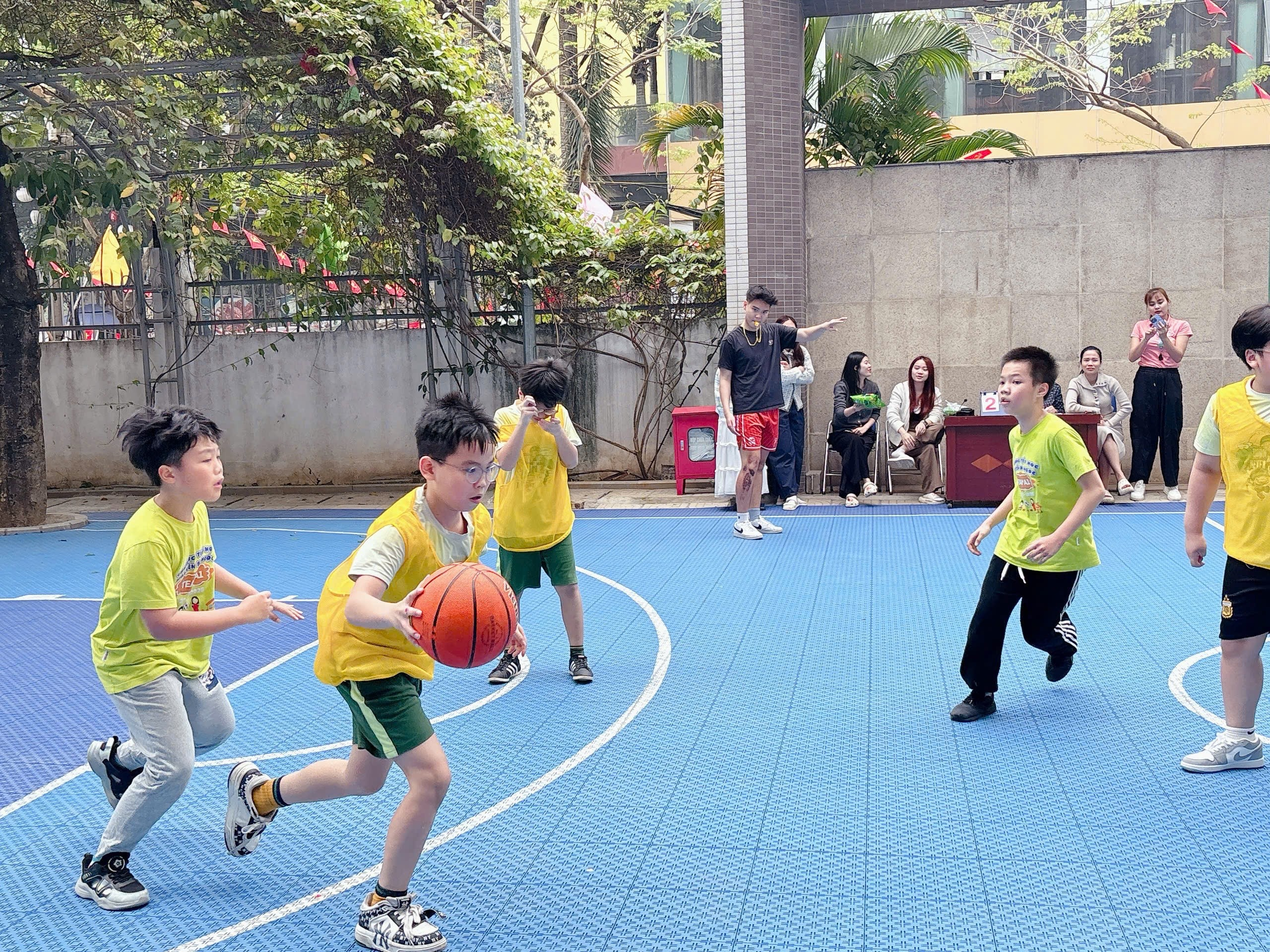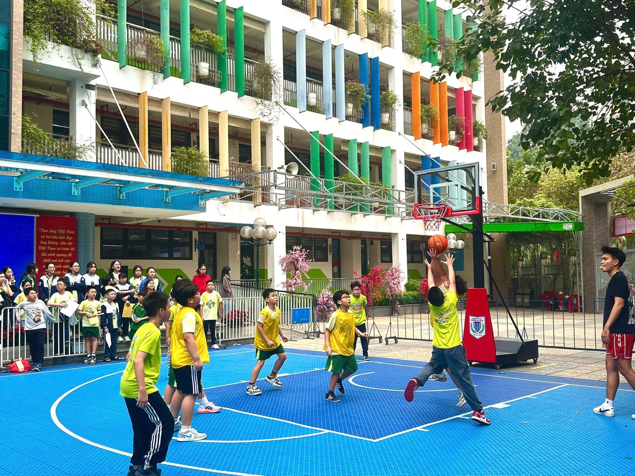 Học sinh thi đấu bóng rổ trên sân sau những giờ học chính khóa.