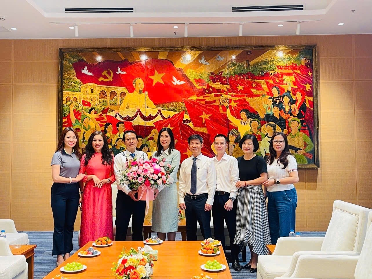 Ban giám hiệu và đồng nghiệp trong tổ chúc mừng 2 cô giáo Khánh Ly và Kim Hiên.