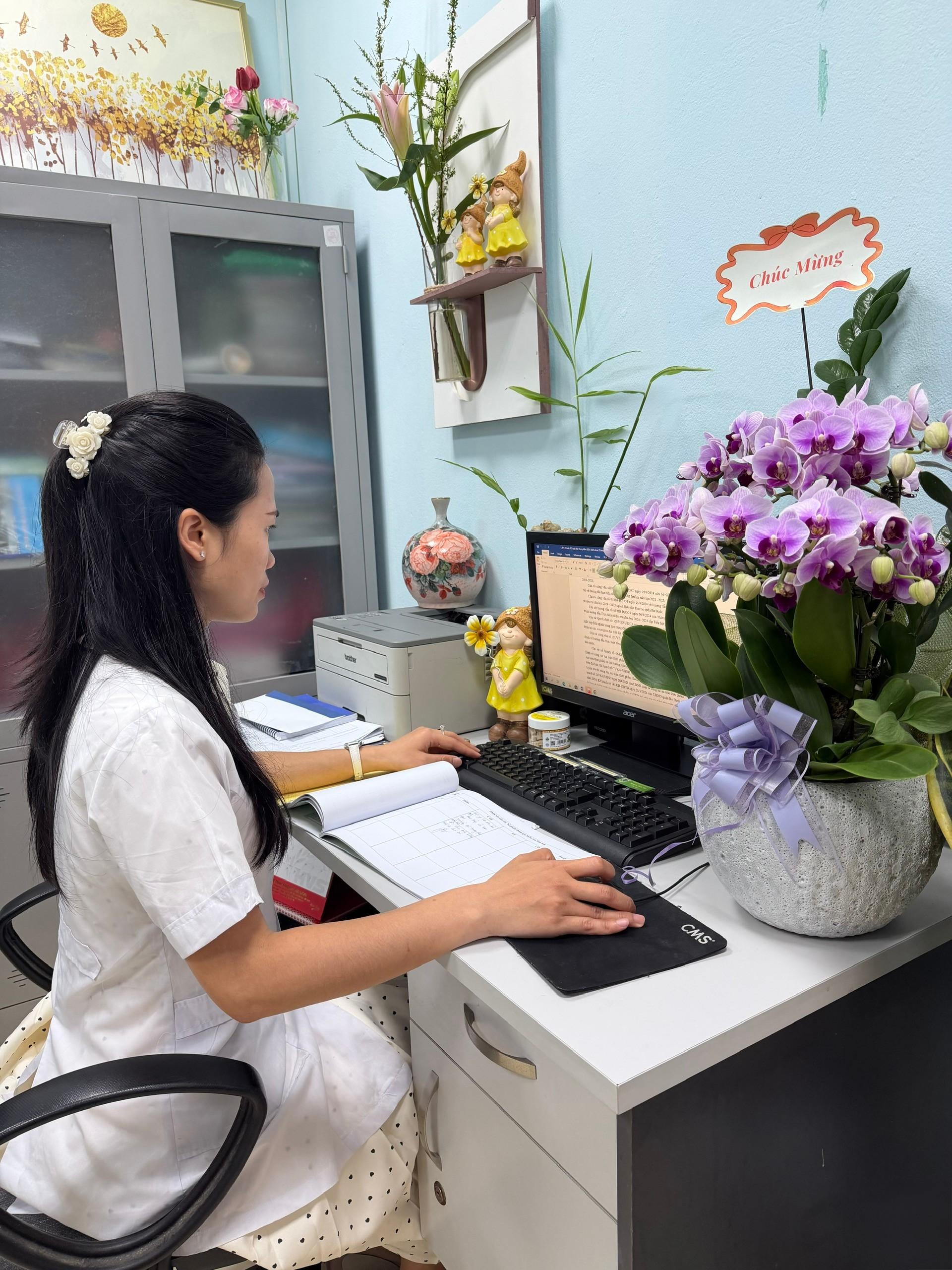 Trong mái trường thân yêu Tiểu học Nguyễn Bá Ngọc, bên cạnh những người thầy, người cô tận tụy gieo chữ, còn có “chiến sĩ áo trắng” âm thầm gìn giữ sức khỏe cho thầy cô và các em học sinh mỗi ngày. Đó chính là cô Nguyễn Bích Việt. Công việc của cô ở trường tuy lặng lẽ nhưng vô cùng quan trọng. Từ việc chăm sóc những vết trầy xước nhỏ khi các em vui chơi, theo dõi sức khỏe định kỳ, tuyên truyền phòng chống dịch bệnh, cho đến việc sẵn sàng có mặt khi có tình huống khẩn cấp xảy ra - tất cả đều đòi hỏi sự tận tâm, kiên nhẫn và trách nhiệm cao cả.