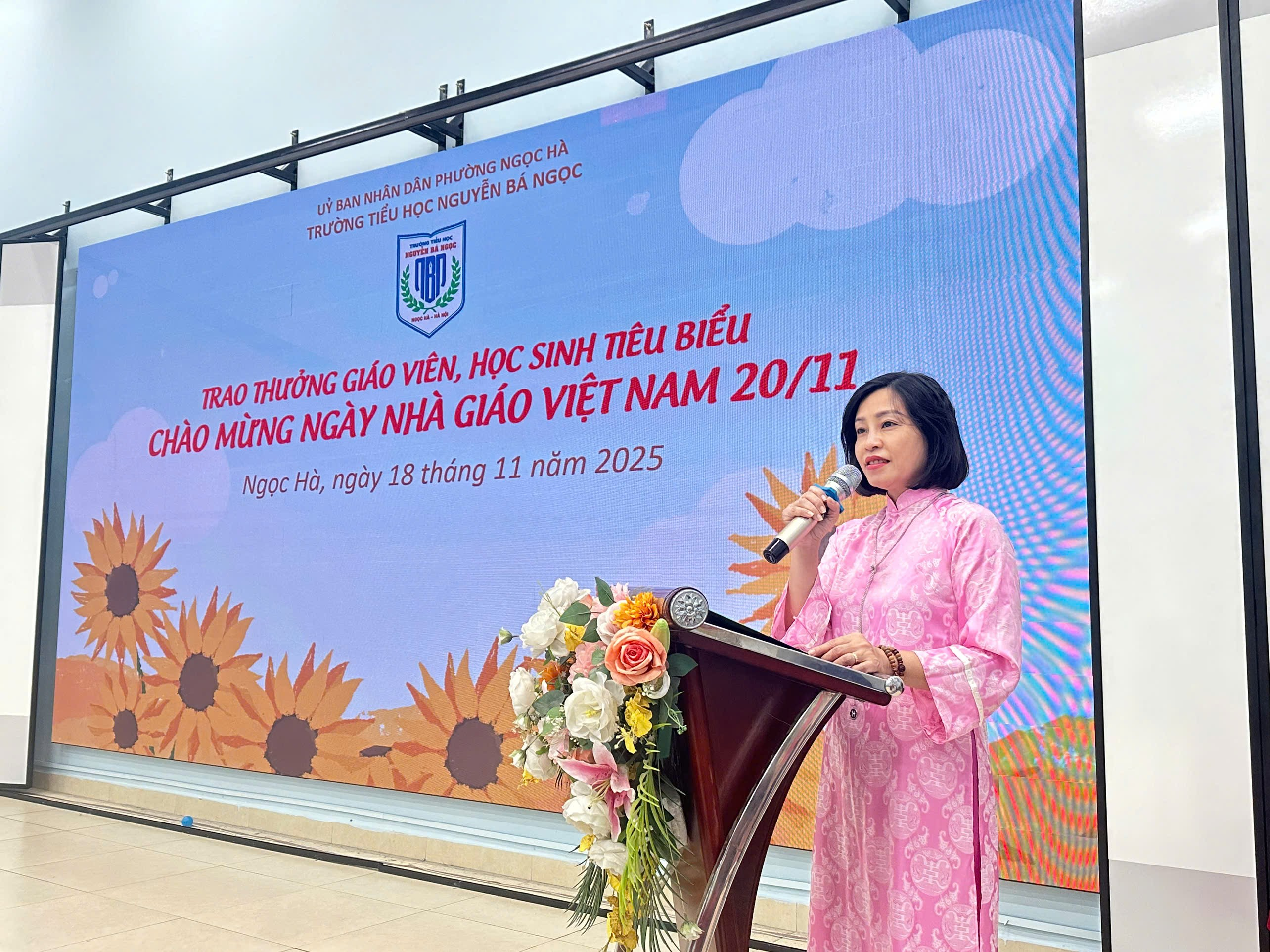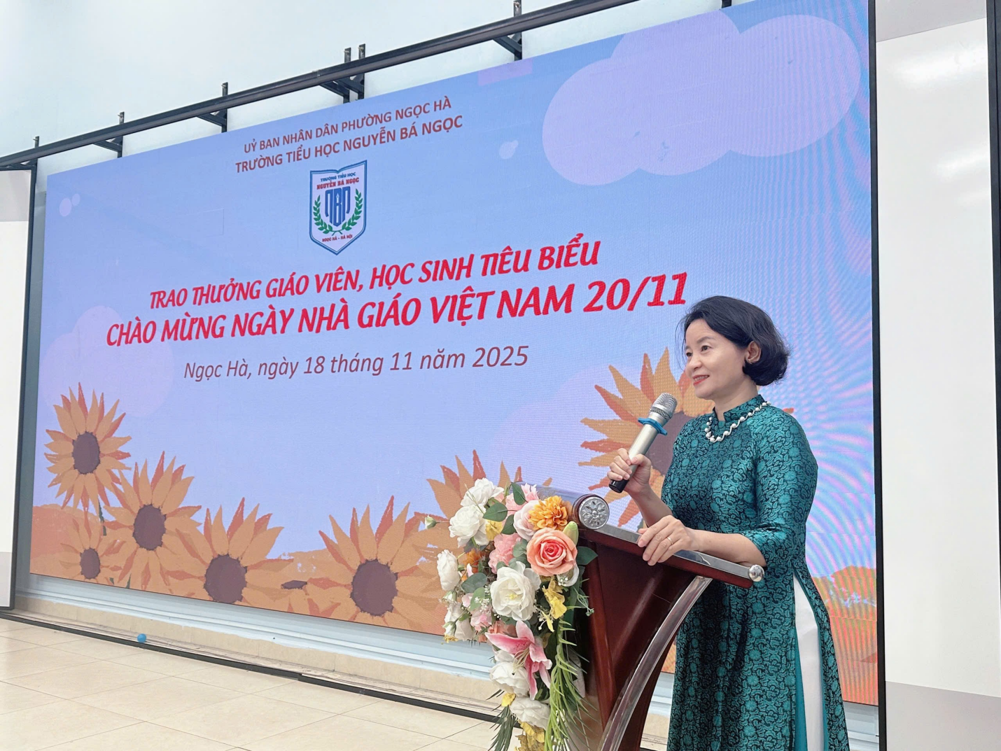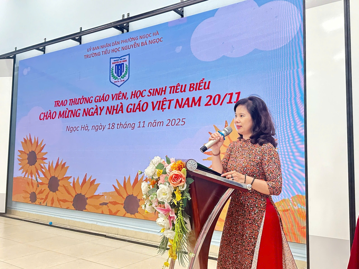 Cô Hoàng Thu Hà - Phó Hiệu trưởng nhà trường phát biểu vinh danh các giáo viên đạt thành tích trong đợt thi đua.