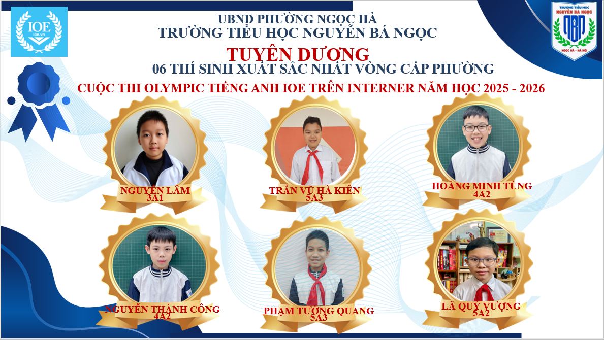Tham gia cuộc thi, các em học sinh Trường Tiểu học Nguyễn Bá Ngọc – phường Ngọc Hà – Hà Nội đã tự tin, bản lĩnh và nỗ lực hết mình. Nhà trường vui mừng và tự hào vinh danh những học sinh xuất sắc đạt giải như sau: