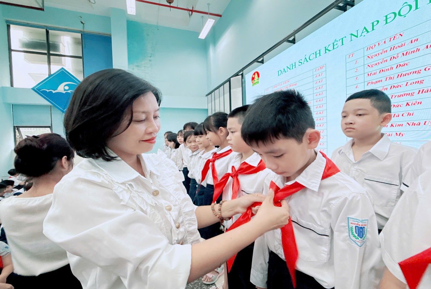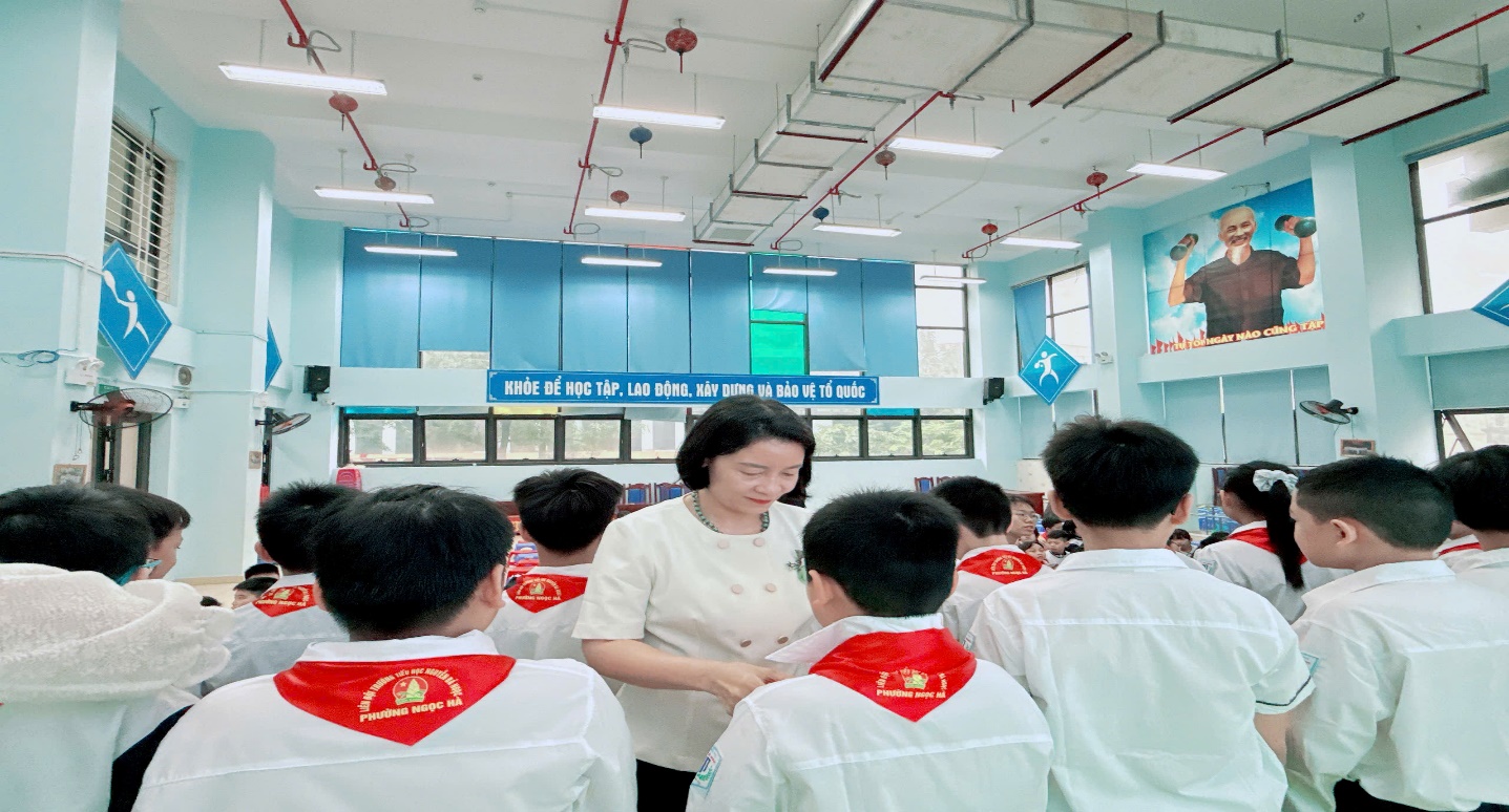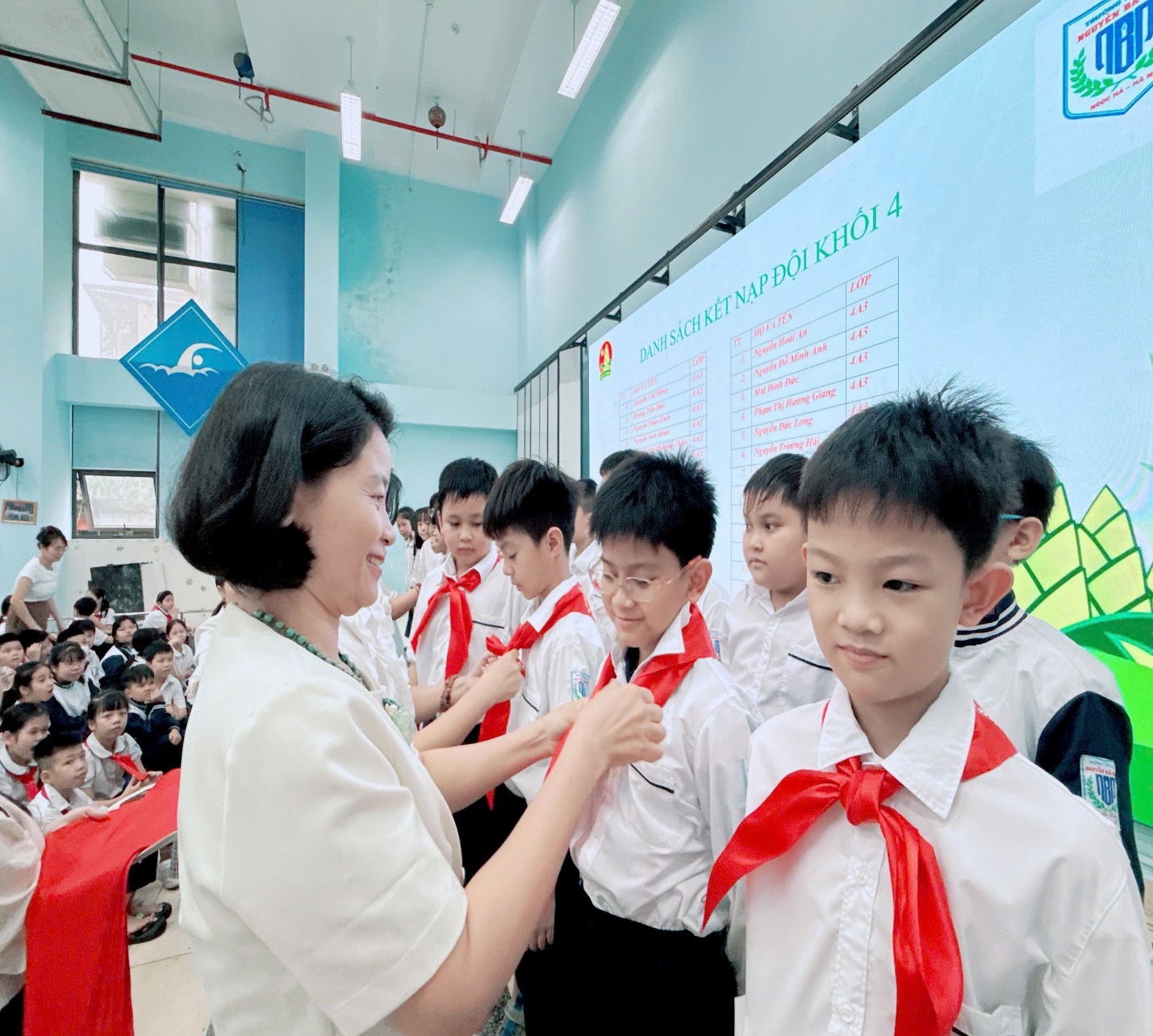 Tiếp đó, Hiệu trưởng nhà trường cô Phùng Tố Nga; Phó Hiệu trưởng nhà trường cô Hoàng Thu Hà đã trang trọng quàng khăn đỏ lên vai các bạn học sinh – những em đã phấn đấu và rèn luyện theo 5 điều Bác Hồ dạy. Từ giây phút ấy, các em chính thức trở thành đội viên của Đội Thiếu niên Tiền phong Hồ Chí Minh.