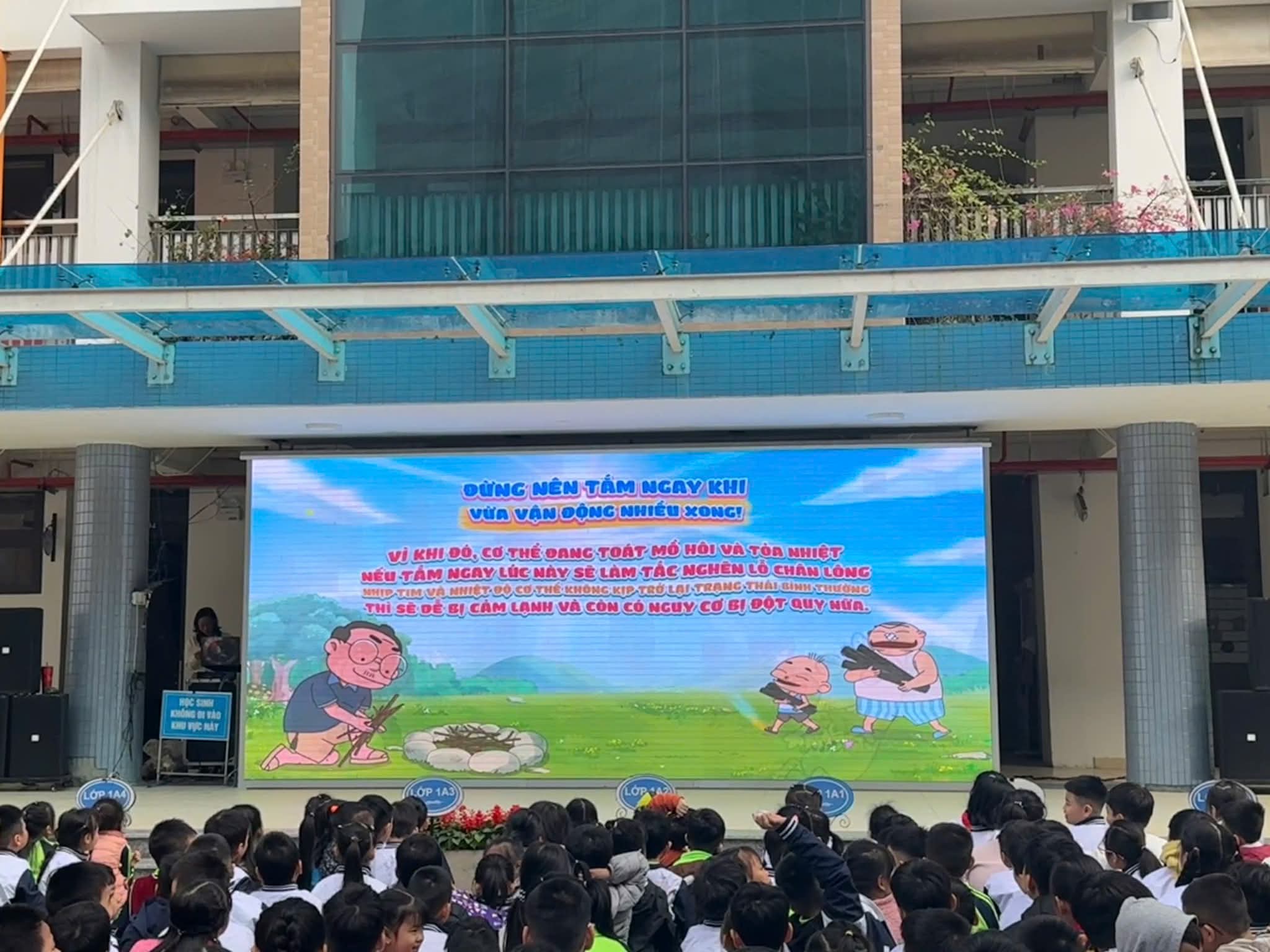 Thông qua chủ đề “Chăm sóc sức khỏe bản thân”, các em học sinh được trang bị những kiến thức cơ bản và thiết thực như: giữ gìn vệ sinh cá nhân, chăm sóc cơ thể hằng ngày, xây dựng thói quen ăn uống khoa học, tích cực rèn luyện thể dục thể thao, nâng cao ý thức phòng tránh bệnh tật và bảo vệ sức khỏe cho bản thân cũng như cộng đồng. Hoạt động tuyên truyền được tổ chức lồng ghép trong buổi sinh hoạt dưới cờ, thu hút sự tham gia nghiêm túc của đông đảo học sinh các khối lớp. Trong quá trình theo dõi video, học sinh chăm chú lắng nghe, tích cực tương tác, thực hiện các động tác minh họa theo hướng dẫn, tạo không khí học tập hào hứng và hiệu quả