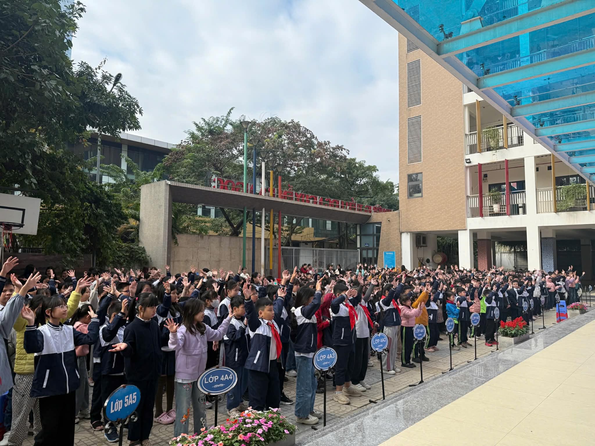 Các em học sinh hào hứng biểu diễn múa hát cuối giờ, góp phần rèn luyện thể chất và tạo không khí phấn khởi trong nhà trường.