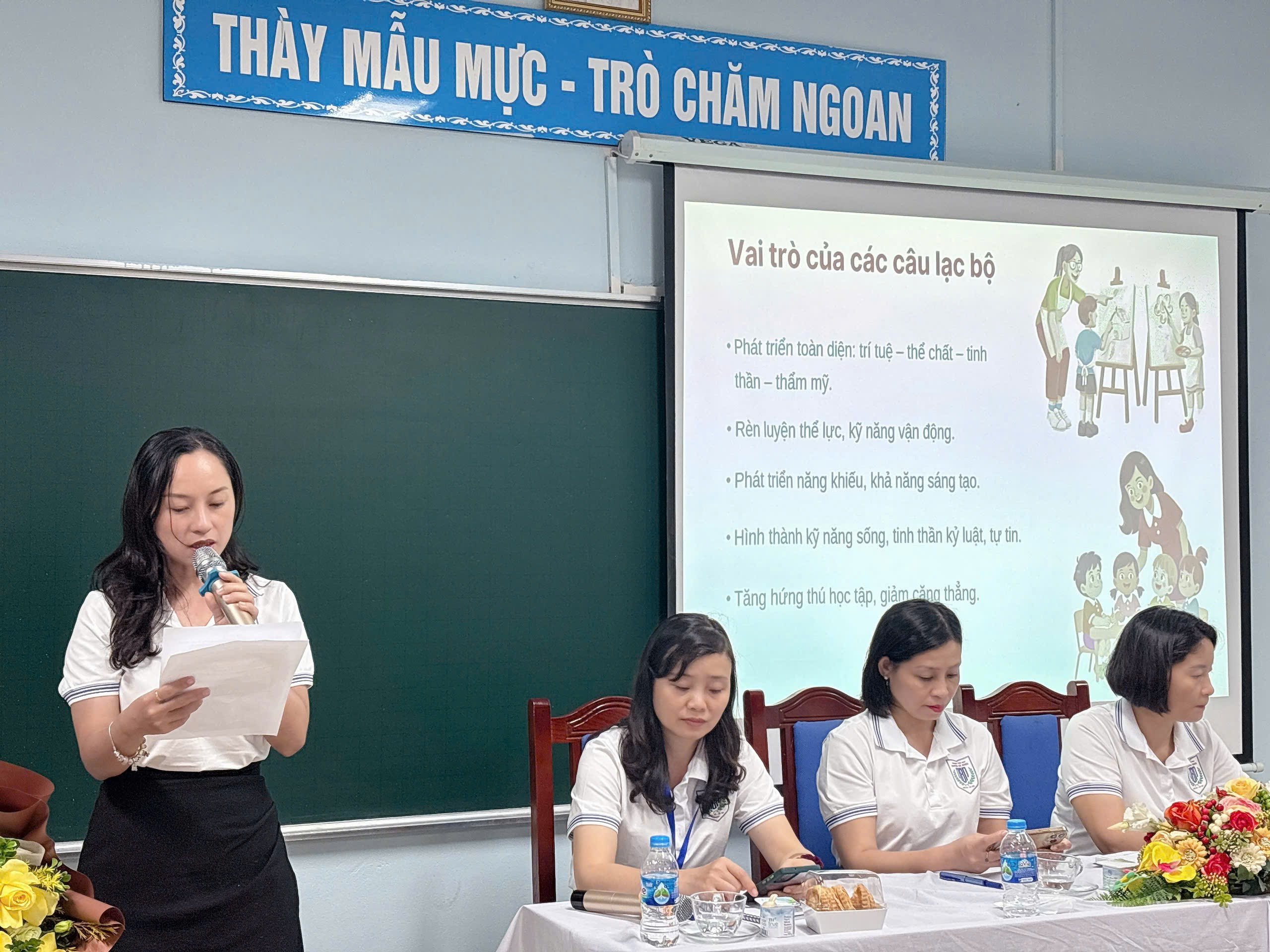 Nhà giáo Hoàng Thu Hà - Phó Hiệu trưởng nhà trường trình bày báo cáo hoạt động năm học